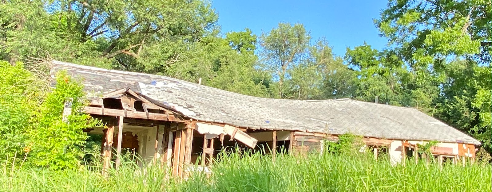 Cleared for now, it has been vacant for over 30 years. Their is now mixed ownership and tension/struggles over what to do with the property.