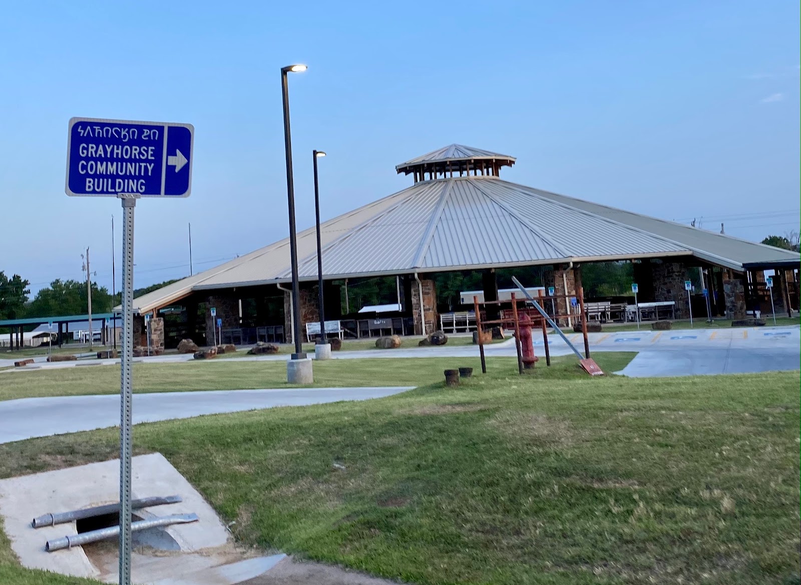 In the mid-1880s the Osage at Gray Horse received the i'n-lon-schka dance, traditions, and drum from the Ponca Indians. In 1908 the Osage built a roundhouse in which they could hold their ceremonial dances, and they later constructed a Native American Church building. In February 1963 a prairie fire destroyed both structures. In spring 1964 a pavilion was built to replace the round house. Small arbors were erected for the clans and for visiting Indians who took part in the yearly celebrations (the i'n-lon-schka dance is held every June, we just missed it, although I am unsure if we would've been invited in).